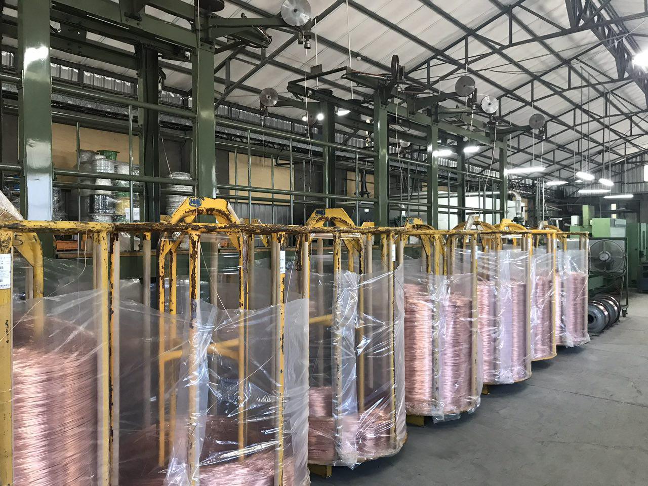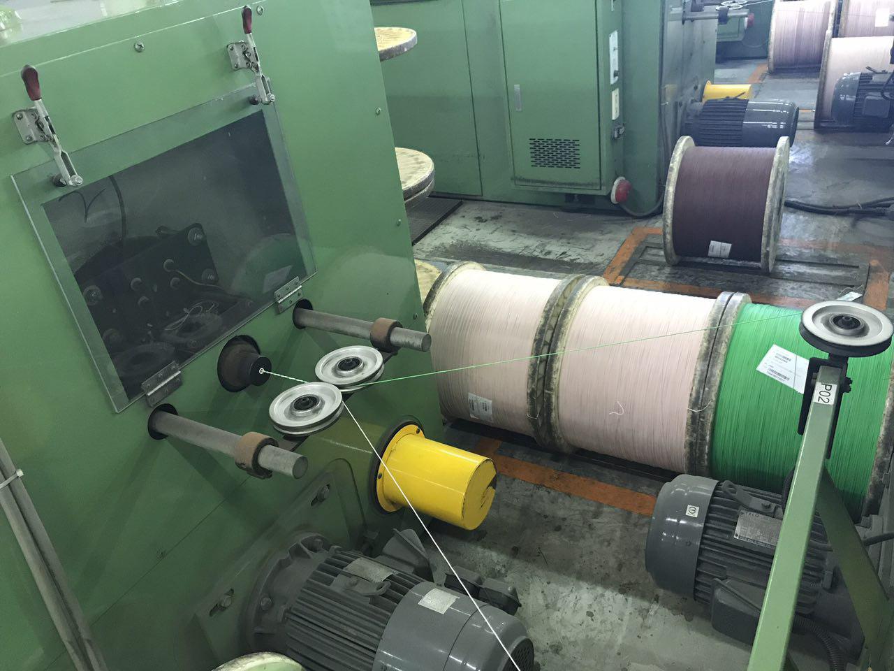 Factory A accomplishes all the stages of cable production here. It all starts with a copper drawing, during which the thick wire is thinned to a conductor measuring 0.511-0.585 mm, depending on cable construction and category. The future stranded (or "patch-cord") cable is waiting for the next stage (conductor bunching) to be executed, when 7 conductors will be combined into one bundle.